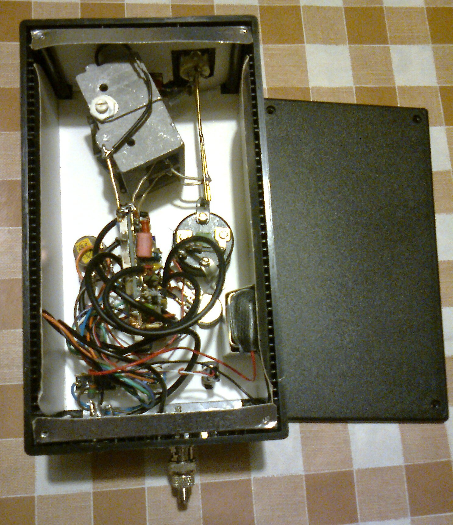 Цялата кутия на прибора е от пластмаса,но за да бъде екранирана отвътре е облепена със специален кухненски картон който е покрит с алуминиево фолио от едната страна. Скалата на променливия кондензатор е от прецизионни многооборотни скали за потенциометри на "RFT" и се ползват само деленията от 0-50. Направена е и таблица на съответствието между честотата на всеки диапазон и показанието на тази логическа скала.